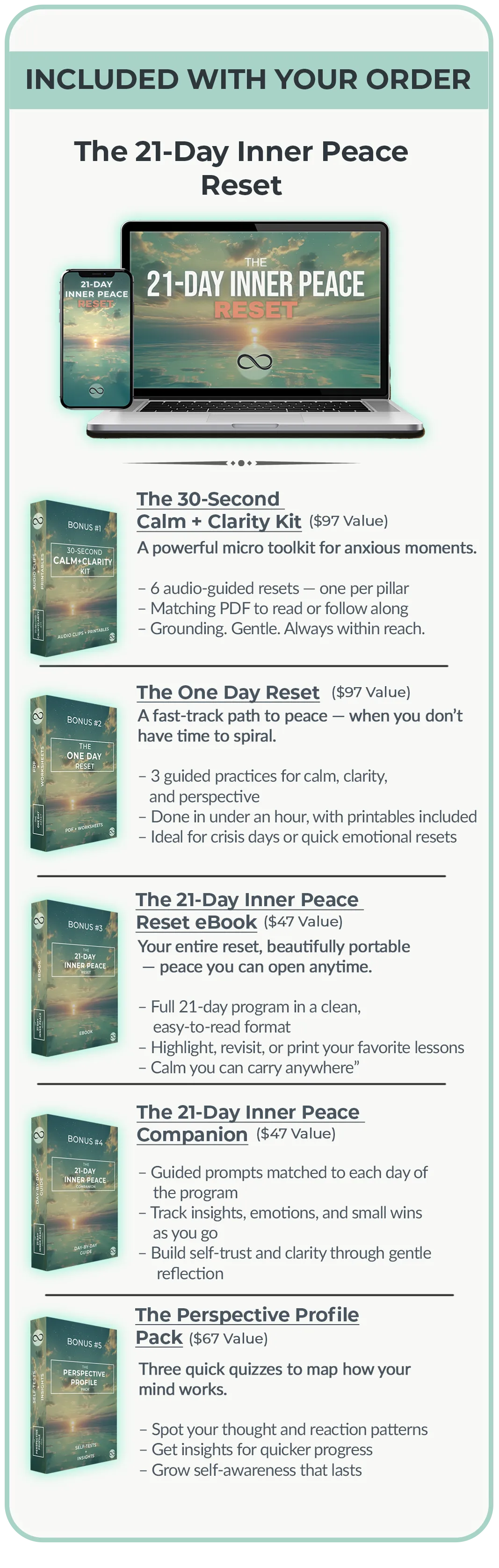 The 21-Day Inner Peace Reset works because it gives you something most advice doesn’t:
